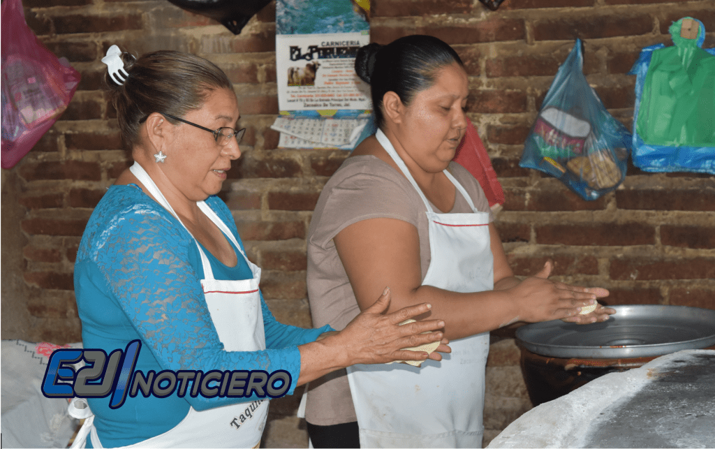 Pasaron apenas quince minutos. Ya dentro, María Rosario me da un breve recorrido por el interior de su casa, confirmo que ahí es el establecimiento donde se preparan y elaboran los famosos tacos torteados. Las paredes son de ladrillo sin revoco (aparente) de donde cuelgan cazuelas y jarros tradicionales de barro, además de utensilios de la cocina tradicional del campo. Sus cobertizos están hechos de lámina galvanizada renegrida por el hollín del humo del fogón. Y heme ahí, frente a la hornilla echo a base de ladrillos y rematada con un comal de barrio, el cual es limpiado afanosamente por una de las empleados que al mismo tiempo atiza el fuego con madera de mezquite, mientras una par de personas salen sacan de la lumbre de al lado un par de cazuela de gran tamaño con los guisados de la casa: frijoles refritos y carne de puerco con adobo. Existe el apoyo para la pequeña empresaria; las sillas, las mesas y los servilleteros también son de la empresa refresquera.