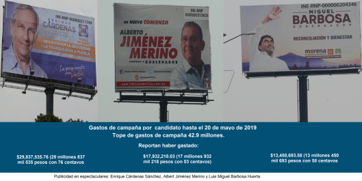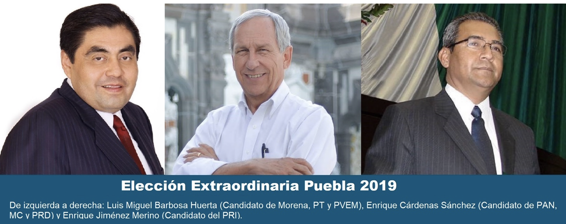 - EL UNIVERSAL obtuvo resultados de preferencias electorales en favor de Luis Miguel Barbosa Huerta, candidato de la coalición Juntos haremos historia conformada por Morena, PT y PVEM con el 47.2%, seguido de Enrique Cárdenas Sánchez candidato del PAN, PRD y MC con el 24. 4% y finalmente de Alberto Jiménez Merino candidato del PRI con el 13.1%. Levantamiento: 01 al 03 de mayo de 2019.